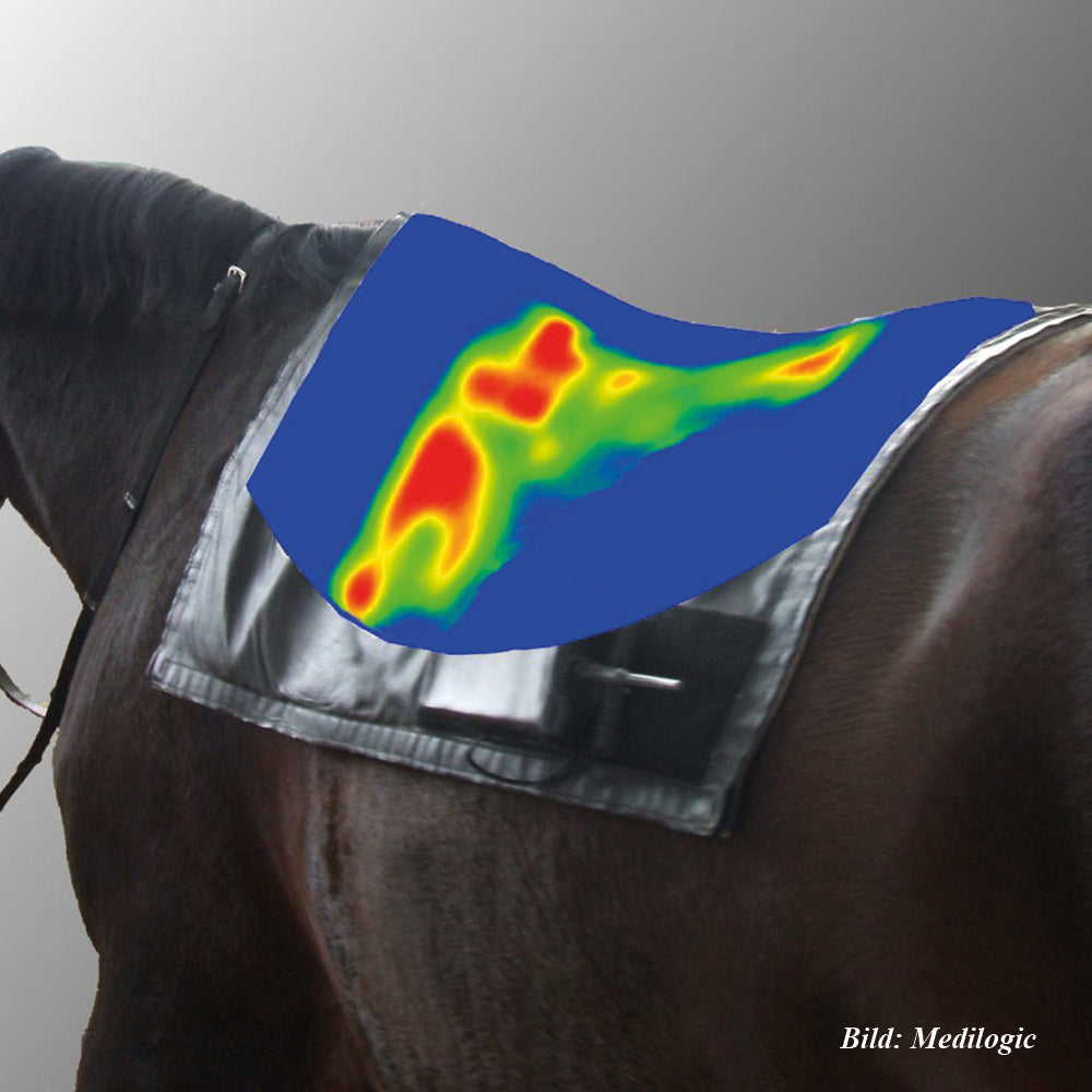 Wir bieten ab sofort Satteldruckmessungen durch die flexible medilogic®Sattelmatte welche die Erfassung der Druckverteilung auf dem Pferderücken ermöglicht. Das komplexe Zusammenspiel der Kraftwirkungen zwischen Pferd, Sattel und Reiter wird in der relevanten Bewegungssituation oder im Stand gemessen und später in der Analysesoftware ausgewertet. Es wird sichtbar, in welcher Bewegungsphase und an welchen Stellen der Sattel unerwünschte Druckspitzen am Rücken des Pferdes verursacht. Ebenso zeigt sich die Gewichtsverteilung des Reiters.